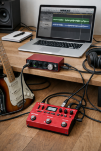 Avant de lancer l'enregistrement : accorder l'instrument, vérifier les câbles, régler le gain une fois pour toutes. Décide en amont si tes effets (reverb, delay) sont capturés dans le signal ou appliqués non-destructifs dans le DAW. Les deux approches sont valables, mais tu ne peux pas changer d'avis après coup.